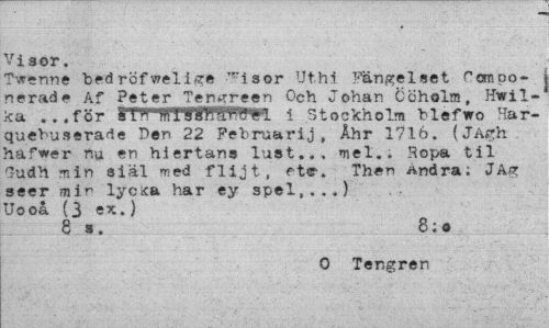//// Vi aor. //// Twenne bed ref weli<?e '"'is or Ut-hi Fängelset Pempo-nerad* Af Peter Ter-rreen Och Johan Coholra, Hwil-:<a ...för HVMSffTgff»*! i Stockholm blefwo Har-quebuserade Ben 22 Februarij , Åhr 1716. (JA^h hafw<?r nu en hiertans lust.., *nel.. Ropa til C-udh min siäl med flljt, ete. Then Andra; JA^ seer mir lyc&a har ey spel,...) Uooå (3 ex.) //// 8 s. 8;o //// 0 Tengren ////