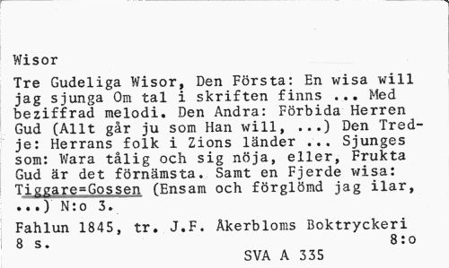 //// Wisor //// Tre Gudeliga Wisor, Den Första: En wisa will jag sjunga Om tal i skriften finns ... Med beziffrad melodi. Den Andra: Förbida Herren Gud (Allt går ju som Han will, ...) Den Tredje: Herrans folk i Zions länder ... Sjunges som: Wara tålig och sig nöja, eller, Frukta Gud är det förnämsta. Samt en Fjerde wisa: Tiggare-Gossen (Ensam och förglömd jag ilar, ...) N:o 3. //// Fahlun 1845, tr. J.F. Åkerbloms Boktryckeri 8 s. 8:o //// SVA A 335 ////
