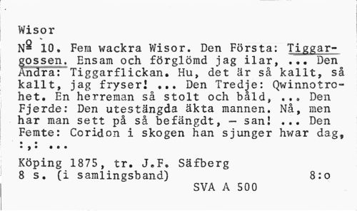 //// Wisor //// N- 10. Fem wackra Wisor. Den Första: Tiggar-gossen. Ensam och förglömd jag ilar, ... Den Andra: Tiggarflickan. Hu, det är så kallt, så kallt, jag fryseri ... Den Tredje: Qwinnotro-het. En herreman så stolt och båld, ... Den Fjerde: Den utestängda äkta mannen. Nå, men har man sett på så befängdt, — sani ... Den //// Femte: Coridon i skogen han sjunger hwar dag, • j • • • • //// Köping 1875, tr. J.F. Säfberg 8 s. (i samlingsband) 8:o //// SVA A 500 ////