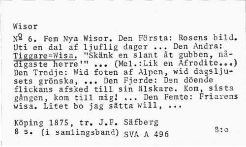 //// Wisor //// N- 6. Fem Nya Wisor. Den Första: Rosens bild. Uti en dal af ljuflig dager ... Den Andra: Tiggare^Wisa. "Skänk en slant åt gubben, nå-cligas te""Herre '" ... (Mel.: Lik en Afrodite...) Den Tredje: Wid foten af Alpen, wid dagsljusets grönska, ... Den Fjerde: Den döende flickans afsked till sin älskare. Kom, sista gången, kom till mig] ... Den Femte: Friarens wisa. Litet bo jag sätta will, ... //// Köping 1875, tr. J.F. Säfberg 8 s. (i samlingsband) SVA A 495 8:0 ////