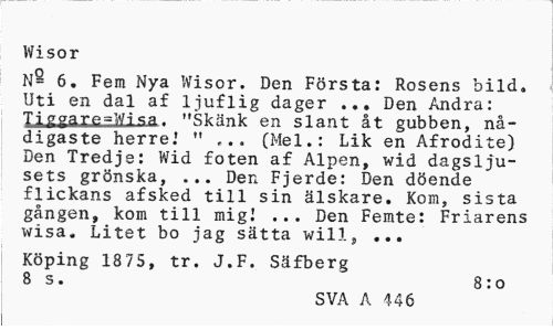 //// Wisor //// N- 6. Fem Nya Wisor. Den Första: Rosens bild. Uti en dal af ljuflig dager ... Den Andra: Ti fpare=Wisa. "Skänk en slant åt gubben, nådigaste herre.' " ... (Mel.: Lik en Afrodite) Den Tredje: Wid foten af Alpen, wid dagsljusets grönska, ... Den Fjerde: Den döende flickans afsked till sin älskare. Kom, sista gången, kom till mig! ... Den Femte: Friarens wisa. Litet bo jag sätta will, ... //// Köping 1875, tr. J.F. Säfberg 8 s. 8:o //// SVA A 446 ////