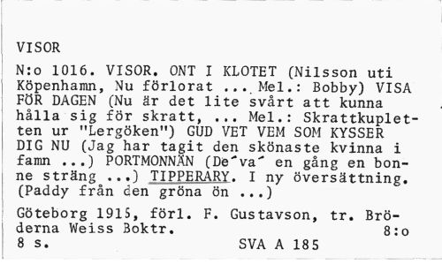 //// VISOR //// N:o 1016. VISOR. ONT I KLOTET (Nilsson uti Köpenhamn, Nu förlorat ...Mel.: Bobby) VISA FÖR DAGEN (Nu är det lite svårt att kunna hålla sig för skratt, ... Mel.: Skrattkupletten ur "Lergöken") GUD VET VEM SOM KYSSER DIG NU (Jag har tagit den skönaste kvinna i famn ...) PORTMONNÄN (De*va" en gång en bonne sträng ...) TIPPERARY. I ny översättning. (Paddy från den gröna ön ...) //// Göteborg 1915, förl. F. Gustavson, tr. Bröderna Weiss Boktr. 8:0 8 s. SVA A 18 5 ////