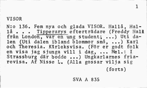 //// 1 //// VISOR //// N:o 136. Fem nya och glada VISOR. Hallå, Hal-lå . . . Tipperarys efterträdare (Freddy Hall från London, var en ung student; ...) Uti dalen (Uti dalen ibland blommor små, ...) Karl och Theresia. Kärleksvisa. (För er godt folk en visa jag sjunga vill i dag, ... Mel.: I Strassburg där bodde Ungkarlarnes fria- //// revisa. Af Nisse L. (Alla gossar vilja sig //// (forts) //// SVA A 835 ////