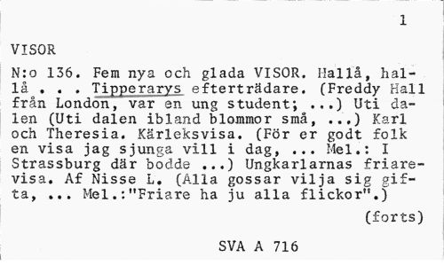 //// 1 //// VISOR //// N:o 136. Fem nya och glada VISOR. Halla, hal-lå , . . Tipperarys efterträdare. (Freddy Hall från London, var en ung student; ...) Uti dalen (Uti dalen ibland blommor små, ...) Karl och Theresia. Kärleksvisa. (För er godt folk en visa jag sjunga vill i dag, ... Mel.: I Strassburg där bodde ...) Ungkarlarnas friare-visa. Af Nisse L. (Alla gossar vilja sig gifta, ... Mel.:"Friare ha ju alla flickor".) //// (forts) //// SVA A 716 ////