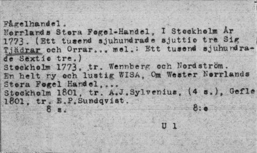 //// Fågelhandel . //// Norrlands Stora Fogel-Handel, I Stockholm År 1773. (Ett tusend sjuhundrade sjuttio tre Sig Tjä^^ftf och Orrar,,. »el. i Ett tusond sjuhundrade Sextio tre.) //// Stockholm 1773, .tr. Wennberg och Nordström. En helt ry och lustig WISA, Om Wester Norrlands Stora Fogel Handel,... //// Stockholm 1801, tr, A.J.Sylvenius, (4 s.), Gefle 1801, tr. E.P.Sundqvist. //// 8 s. 8; o //// U 1 ////