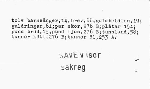 //// tolv barnsånger,14;brev,66;guldbelåten,19; guldringar,6l;par skor,276 Bjplåtar 154; pund bröd,19;pund ljus,276 B;tunnland,58; tunnor kött,276 B;tunnor öl,253 A' //// bAvE visor sakreg ////