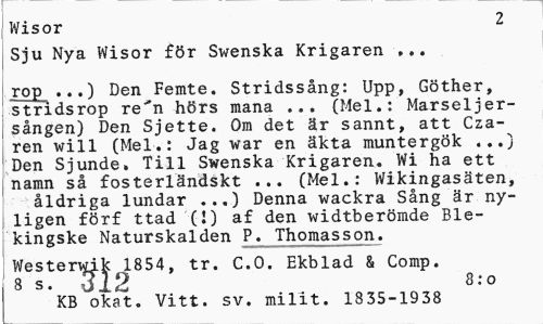 //// Wisor 2 //// Sju Nya Wisor för Swenska Krigaren ... //// rop ...) Den Femte. Stridssång: Upp, Göther, stridsrop re"n hörs mana ... (Mel.: Marseljer-sången) Den Sjette. Om det är sannt, att Cza-ren will (Mel.: Jag war en äkta muntergök ...) Den Sjunde. Till Swenska Krigaren. Wi ha ett namn så fosterländskt ... (Mel.: Wikingasäten, åldriga lundar ...) Denna wackra Sång är nyligen förf ttad (I) af den widtberömde Blekingske Naturskalden P. Thomasson. //// Westen^ik 1854, tr. C.O. Ekblad & Comp. //// 8 s. 322 8:o //// KB okat. Vitt. sv. milit. 1835-1938 ////