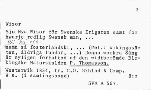 //// 3 //// Wisor //// Sju Nya Wisor för Swenska Krigaren samt för hwarje redlig Swensk man, ... //// m: Ac/ 3 //// namn så fosterländskt, ... (Mel.: Wikingasä-ten, åldriga lundar, ...) Denna wackra Sång är nyligen författad af den widtberömde Blekingske Naturskalden P. Thomasson. //// Westerwik 1854, tr. G.O. Ekblad 8. Comp. 8 s. (i samlingsband) 8:o //// SVA A 56 7. ////