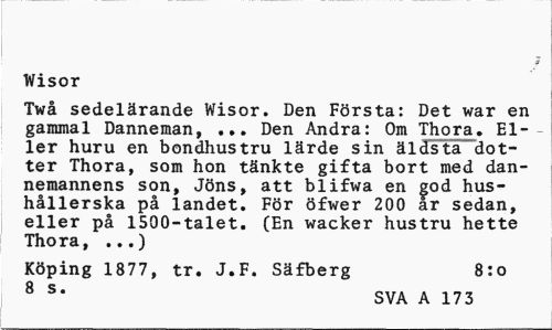 //// Wisor //// Twå sedelärande Wisor. Den Första: Det war en gammal Danneman, ... Den Andra: Om Thora. Eller huru en bondhustru lärde sin äldsta dot-ter Thora, som hon tänkte gifta bort med dan-nemannens son, Jöns, att blifwa en god hushållerska på landet. För öfwer 200 ar sedan, eller på 1500-talet. (En wacker hustru hette Thora, ...) //// Köping 1877, tr. J.F. Säfberg 8:o //// 8 S* SVA A 173 ////