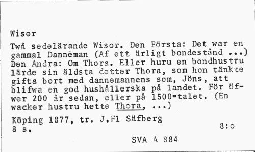 //// Wisor //// Twå sedelärande Wisor. Den Första: Det war en gammal Danneman (Af ett ärligt bondestånd ...) Den Andra: Om Thora. Eller huru en bondhustru lärde sin äldsta dotter Thora, som hon tänkte gifta bort med dannemannens som, Jöns, att blifwa en god hushållerska på landet. För öfwer 200 år sedan, eller på 1500-talet. (En wacker hustru hette Thora, ...) //// Köping 1877, tr. J.F1 Säfberg 3 s. 8: o //// SVA A 884 ////