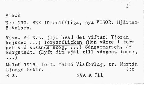 //// 2 //// VISOR //// N:o 130. SEX förträffliga, nya VISOR. Hjärter-ö-Valsen. //// Visa. Af N.L. (Tjo hvad det viftarj Tjosan hejsani ...) Torparflickan (Hon växte i torpet vid susancTe" skog, ...) Sångarmarsch. Af Bergstedt. (Lyft din själ till sångens toner, //// Malmö 1915, förl, Malmö Visförlag, tr, Martin Ljungs Boktr. 8:o //// 8 s. SVA A 711 ////