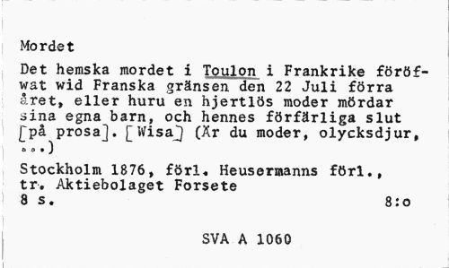 //// xMordet //// Det hemska mordet i Toulon i Frankrike föröf-wat wid Franska gränsen den 22 Juli förra året, eller huru en hjertlös moder mördar sina egna barn, och hennes förfärliga slut [på prosa]. [WisaJ (Är du moder, olycksdjur, //// j o a » ) //// Stockholm 1876, förl., Heusermanns förl., tr. Aktiebolaget Forsete //// 8 s. 8:o //// SVA A 1060 ////