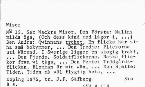 //// Wisor //// N® 15, Sex Wackra Wisor, Den Första: Malins milda öga, (Och dess kind med lågor i, ...) Den Andra: Qwinnans trohet_. En flicka har sina små bekymmer, Den Tredje: Flickorna uti Wärend. I Swerige ligger en skogig trakt, ... Den Fjerde. Soldatflickorna. Raska flickor fram wi tåga, ... Den Femte: Trädgårdsflickan. Blomman är min wän, ... Den Sjette: Tiden. Tiden må v/äl flygtig heta, ... //// Köping 1375, tr. J.F. Säfberg Sto //// O S • rMrAA-i-io ////