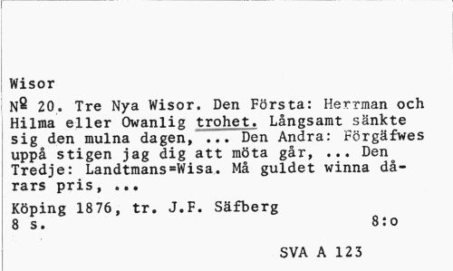 //// Wisor //// N^ 20. Tre Nya Wisor. Den Första: Herrman och Hilma eller Owanlig trohet. Långsamt sänkte sig den mulna dagen, ... Den Andra: Förgäfwes uppå stigen jag dig att möta går, ... Den Tredje: Landtmans=Wisa. Må guldet winna dårars pris, ... //// Köping 1876, tr. J.F. Säfberg 8 s. 8:o //// SVA A 123 ////
