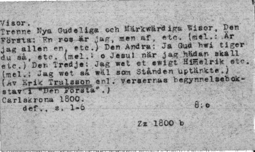 //// Vi»or. //// Trenne Nya Gudeliga och Märlcwärd ig* Wisor, Pen Första; tfn ros 4ir .tag, men af , «tc. (mel.: Är jag allén en. etc.) Den Andra: Ja Qud bwi tiger du så, etc. (mel.i o Jesul när jag h&dan akill etc.} Den Tredje:.Jag wet et ewigt Himelrik^etc. (mel.; Jag wet ak wäl som Stånden uptärkte.) (Av Krik Trulaaon enl. versernas begynnelsebok:- //// Carl skröna 1800. //// def., s. 1-6 S;o //// Zz 1800 b ////