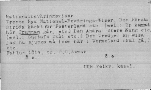 //// Na 11 ora 11 e vä r i r. ~sv i s or //// Trfr n e Nya Na t i o na 1 - B e wä r i r ¦ g s - %' is«rD c r F örsta Strida käckt får Fosterland etc. (mel : Up kanaat hor Trn-TiiT-an når, etcj Pen Andra. Store *un« etc (mel-"" Gustafs Skål etc,) Den Tredje; Ef; wisa jas nu sjunga må (som här i Wermelard skal gå,.» e t c //// Fahlur 1814, tr, r\C„Axjrar //// 8 s. 8 o //// UUB Folkv. kapal, ////