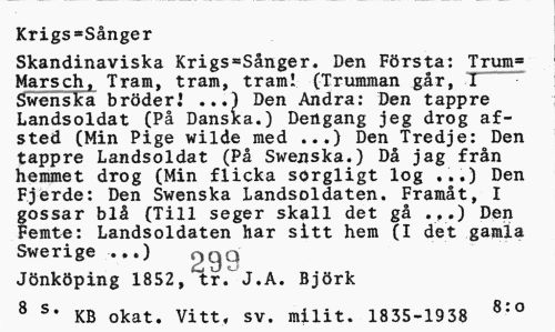 //// Krigs=Sånger //// Skandinaviska Krigs=Sånger. Den Första: Trum» Marsch, Tram, tram, tram! (Trumman går, I Swenska broderi ..,) Den Andra: Den tappre Landsoldat (På Danska.) Dengang jeg drog af-sted (Min Pige wilde med ...) Den Tredje: Den tappre Landsoldat (På Swenska.) Då jag från hemmet drog (Min flicka sorgligt log ...) Den Fjerde: Den Swenska Landsoldaten. Framåt, I gossar blå (Till seger skall det gå .,.) Den Femte: Landsoldaten har sitt hem (I det gamla Swerige ...) ^q //// Jönköping 1852,"tr. J.A. Björk 8 s> KB okat. Vitt, sv. milit. 1835-1938 8:0 ////