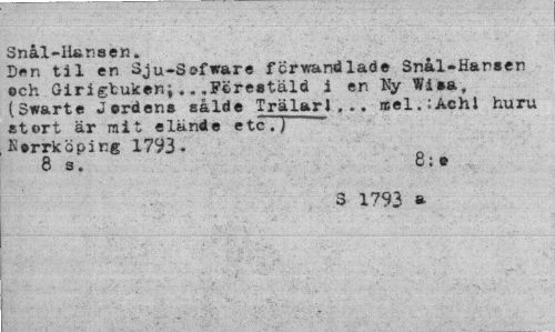 //// Snål-Ii&nsen. //// Den til en Sju-8efware förvandlade Snål»Harsen och Girigtuken;.„.Förestäld i en Ny Wisa, (Swarte Jordens sålde Irälarl , >. mel.:Aehl huru stort är mit elände etcTJ "" Norrköping 17V3. //// 8 s. 8;e //// 3 1793 ////