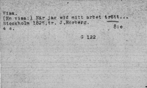 //// Visa. //// (En visa;). När jag wld mitt arbet trött... Stockholm l82c, tr. J.Hörberg. 4 s. . , 8:0 //// G 122 //// i ////