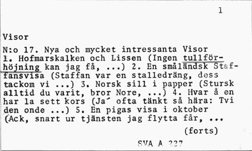 //// 1 //// Visor //// Nio 17. Nya och mycket intressanta Visor 1. Hofmarskalken och Lissen (Ingen tullförhöjning kan jag få, ..*) 2. En småländsk Staffansvisa (Staffan var en stalledräng, dess tackom vi ...) 3. Norsk sill i papper (Stursk alltid du varit, bror Nore, ...) 4. Hvar å en har la sett kors (Ja" ofta tänkt så hära: Tvi den onde ...) 5. En pigas visa i oktober (Ack, snart ur tjänsten jag flytta får, ... //// (forts) //// SVA A ?27 ////