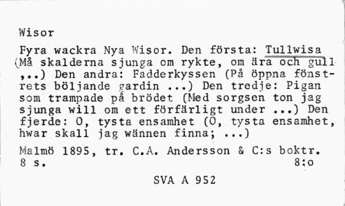 //// Wisor //// Fyra wackra Nya Wisor. Den första: Tullwisa (Må skalderna sjunga cm rykte, om ära och gull ,..) Den andra: Fadderkyssen (På öppna fönstrets böljande gardin ...) Den tredje: Pigan som trampade på brödet (Med sorgsen ton jag sjunga will om ett förfärligt under ...) Den fjerde: O, tysta ensamhet (O, tysta ensamhet, hwar skall jag wännen finna; ...) //// Malmö 1895 , tr. C.A. Andersson & C:s boktr. 8 s. 8 J o //// SVA A 952 ////