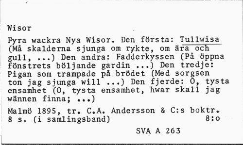//// Wisor //// Fyra wackra Nya Wisor. Den första: Tullwisa (Må skalderna sjunga om rykte, om ära och gull, ...) Den andra: Fadderkyssen (På öppna fönstrets böljande gardin Den tredje: //// Pigan som trampade på brödet (Med sorgsen ton jag sjunga will ...) Den fjerde: O, tysta ensamhet (0, tysta ensamhet, hwar skall jag wännen finna; ...) //// Malmö 1895, tr. C.A. Andersson & C:s boktr» 8 s. (i samlingsband) 8:o //// SVA A 26 3 ////