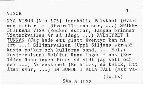 //// VISOR 1 //// NYA VISOR (N:o 175) Innehåll: Falskhet (Hvart man tittar - öfverallt man ser, ...) SPINN-PLICKANS VISA (Rocken surrar, lampan brinner Vinterkvällen är så lång; ...) ÄVENTYRET I TUNNAN (Jag hade ett glatt äventyr kan ni tro ...) Siljansvalsen (Uppå Siljans strand knyta pojkar och kullorna band, ... Mel.: Kostervalsen) Belåten ännu ingen finns (Belåten ännu ingen finns så vidt jag sett och ser ...) Äktenskapet (En blick, så kvick, Ett åter svar, ...) EN BONDE I ALLA FALL (Att va- //// (forts) //// SVA A 10 2 8 ////