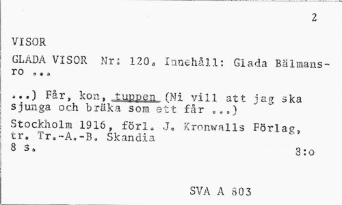 //// 2 //// VISOR //// GLADA VISOR Nr; 120„ Innehåll: Glada Bälmans-ro ». a //// ...) Får, kon, tuppen fNi vill att jag ska sjunga och bräka som ett får ..») //// Stockholm 1916, förl* J„ Kronwalls Förlag, tr. Tr.-A.-B, Skandia //// 8 S» 8:o //// SVA A 803 ////
