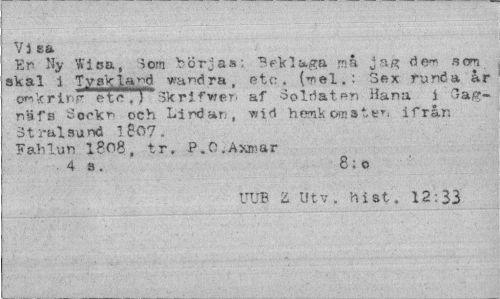 //// Vi //// Er Ny Wisa, Som börjas; "Beklaga må jag fie« sw skal i Tyskland wa^dra, etc. (*riel.: Sex runda ar o^krinp- ete Skrifwer. af Soldaten Ha na i ^ag-n^fs öoekn och Lindan, vid hemkomsten ifrån 3 tråls and 1807. Fahlun l808, tr. P.O.Axmar //// 4a. 8;o //// UUB Z Ut v. ftiat. 12:33 ////