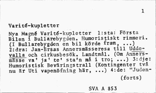 //// 1 //// Varité-kupletter //// Nya Magné Varité-kupletter l:sta: Första Bilen i Bullarebygden. Humoristiskt rimmeri. {I Bullarebygden en bil körde fram, ...) 2:dra: Jan-Brsas Annersmässeresa till Uddevalla och cirkusbesök. Landtmål. (Om Anners-mässe va' ja1 te' sta'n raå i tro; ...) 3:dje: Humoristisk Beväringstrall (Kontingenter två nu är Uti vapenöfning här, ...) 4:de: "Juden- //// (forts) //// SVA A 85 3 ////