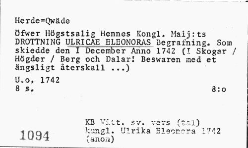 //// Herde=Qwäde //// öfwer Högstsalig Hennes Kongl. Maijits DROTTNING ULRICAE ELEONORAS Begrafning. Som skiedde den I December Anno 1742 (I Skogar / Högder / Berg och Dalarl Beswaren med et ängsligt återskall ...) //// U.o, 1742 //// 8 s, 8:o //// KB Vitt. sv. vers Ctal) 1nn- kungl. Ulrika Eleonora 1742 //// lUy-l Canon) ////