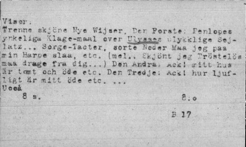 //// Vis ti*. //// Trenne skjcne %e Wijaer, Ter Förste renlof.ec yrke liga Xlage-m&al over Ulyss.e.? .lyiklige Sej-latz... Sorge-Tacter, sorte ftoder Maa jag paa a-in Harte slaa, etc. (mel., tkjönt j 7'röstelo» aaa irage ?ra dig...} Den Andra.- ack I iritt hus är tamt och öde etc. Den Tredje: ac'< l hur ljuf-1 ig t är mitt öde etc. ... Dooå //// 8 s. 8 . o //// B 27 ////