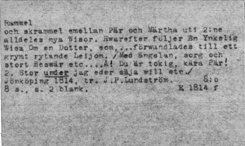 //// Rammel //// och litram*l emellan Pär och Martha uti 2;ne alldeles nya Msor. Kwarefter följer Bn Ynkelig i wisa Om sr Dotter, som, . ,..fcrwandlades till ott 1 srrymt rytande LeJjon. /Med ängslan, sorg och stort Beswår etc...A» Du är tokig, sära Pär! v 2. Stor undsg jag eder säja wiU «tr> S . ^cnköping 1314. tr, J .P.Lundström. $; o //// t a * «• 2 hlank:. Ä 1814 f //// i.' • ' ; ¦ ¦¦ . ' -y. - ¦ //// h ¦ % • ->: ., imm^w .. : .. - : ••, . //// ' » .t- •• .. "ti ••; -y , ! SS? ' . ////