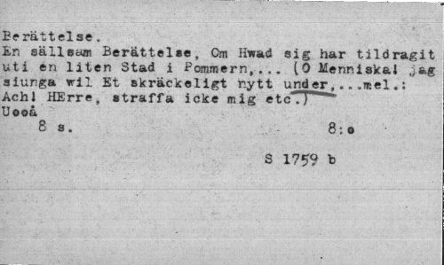 //// Eerättelse. //// En sällsam Berättelse, Cm Hwad sig har tildragit uti en liten Stad i Pommern,... (OMenniskaJ .jag siunga vil Et skräckeligt nytt under...mel.: Achl HErre, straffa icke mig etc .] Uooå //// 8 8. 8:0 //// S 175? h ////