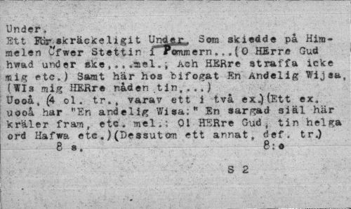 //// Under. //// St t Rjr^skräckeligi t Under Som skiedde på Him-melen Cfwer St ett in jTrommern... (O HErrc Gud hwad under éke,,. .tael.; Ach HKRre straffa icke mig etc.) Samt här hos bifogat En Andelig Wijsa, (WIs mig HERre nåden tin...) Uooå, (4 ol . tr. , varav ett i två ex.) (Ett ex. uooå har "En andelig Wisa:* En sargad siäl här kråler fram, etc. mel.; Oi HERre Gud, tin helga ord Hafwa etc.) (Dessutom ett annat, def. tr.) 8 s. 8;e //// S 2 ////