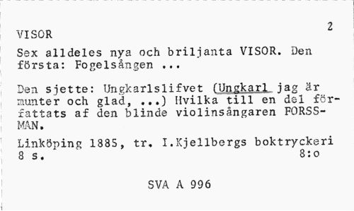 //// VISOR 2 //// Sex alldeles nya och briljanta VISOR. Den första: Fogelsången ... //// Den sjette: Ungkarlslifvet fUngk?rl jag är munter och glad, ...) Hvilka till en del författats af den blinde violinsångaren FORSSMAN. //// Linköping 1885, tr. I.Kjellbergs boktryckeri 8 s. 8:o //// SVA A 996 ////