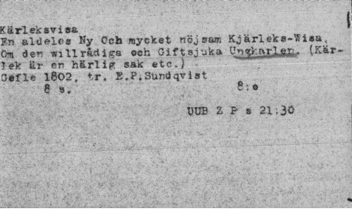 //// Kärleksvisa //// Fn alUelee Ny Och mycket nöjsam Kjärleks-Wisa, Om den wi 11 rad i ga och Gift sjuka PnffiarLeXl» (Kärlek ar en harlie sak etc.) ' Qefle 1802, tr. E.P.Sundqvist //// e s. e.o //// UUB 2 P s 21;30 ////