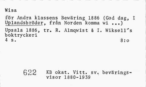 //// Wisa //// för Andra klassens Bewäring 1886 (God dag, I Uplandsbröder, från Norden komma wi ...) //// Upsala 1886, tr. R. Almqwist & I. Wiksell"s boktryckeri //// 4 s. 8: o //// 622 KB okat. Vitt. sv, bevärings- //// visor 1880-1939 ////