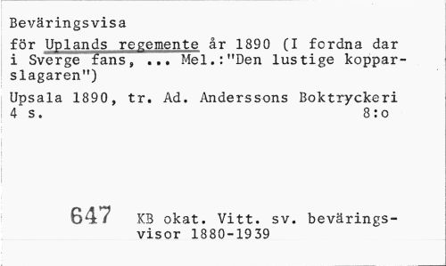 //// Beväringsvisa //// för Uplands regemente år 1890 (I fordna dar i Sverge fans, ... Mel.:"Den lustige kopparslagaren") //// Upsala 1890, tr. Ad. Anderssons Boktryckeri 4 s. 8:o //// 647 KB okat. Vitt. sv. bevärings- //// visor 1880-1939 ////