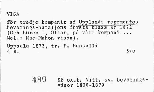 //// VISA //// för tredje kompanit af Upplands regementes bevärings-bataljons första klass år 1872 (Och hören I, Ollar, på vårt kompani ... Mel.: Mac-Mahon-visan). //// Uppsala 1872, tr. P. Hanselli 4 s. 8:o //// 480 KB okat. Vitt. sv. bevärings- //// visor 1800-1879 ////