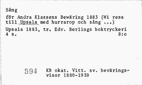 //// Sång //// för Andra Klassens Bewäring 1883 (Wi resa till llpsala med hurrarop och sång ...) //// Upsala 1883, tr. Edv. Berlings boktryckeri 4 s. 8:o //// c;Q4 KB okat. Vitt. sv. bevärings- //// visor 1880-1939 ////