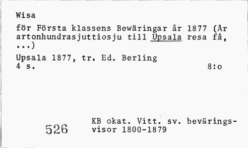 //// Wisa //// för Första klassens Bewäringar år 1877 (År artonhundrasjuttiosju till Upsala resa få, •..) //// Upsala 1877, tr. Ed. Berling 4 s. 8:o //// KB okat. Vitt. sv. bevärings- //// 526 visor 1800-1879 ////