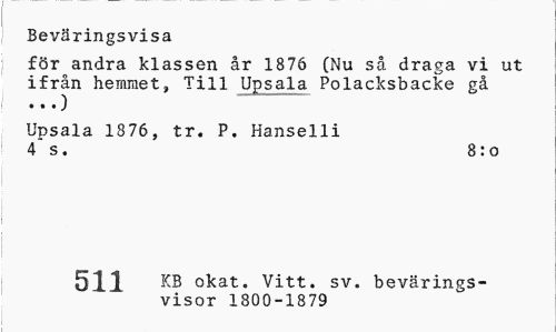 //// Beväringsvisa //// för andra klassen år 1876 (Nu så draga vi ut ifrån hemmet» Till Upsala Polacksbacke gå • • •) //// Unsala 1876, tr. P. Hanselli 4 s. 8:o //// - f n KB okat. Vitt. sv. bevärings- //// 4^0 visor 1800-1879 ////