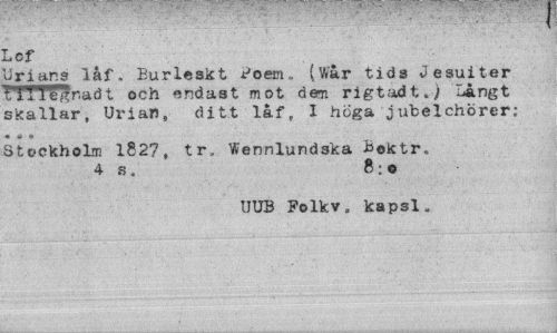//// ; ¦ - •...¦ • • \ //// Lcf //// Ur iang låf. Burleskt Poem„ (Wår tids Jesuiter Ii I iTgr.ad t och endast mot dem rigtadt,) Långt //// skallar, UriarJ, ditt låf, I höga jubelchörer: //// * * * //// StockhoLT! 182?, tr, Wennlundska Boktr. //// 4 s, 8:0 //// IIUB Polkv. kapsl. ////