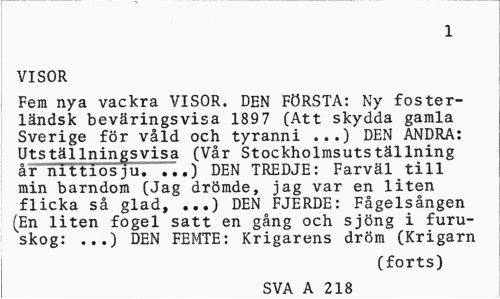 //// 1 //// VISOR //// Fem nya vackra VISOR. DEN FÖRSTA: Ny fosterländsk beväringsvisa 189 7 (Att skydda gamla Sverige för våld och tyranni ...) DEN ANDRA: Utställningsvisa (Vår Stockholmsutställning år nittiosju. ...) DEN TREDJE: Farväl till min barndom (Jag drömde, jag var en liten flicka så glad, ...) DEN FJERDE: Fågelsången (En liten fogel satt en gång och sjöng i furuskog: ...) DEN FEMTE: Krigarens dröm (Krigarn //// (forts) //// SVA A 218 ////