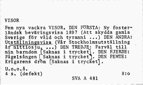 //// VISOR //// Fem nya vackra VISOR. DEN FÖRSTA: Ny fosterländsk beväringsvisa 1897 (Att skydda gamla Sverige för våld och tyranni ...) DEN ANDRA: Utställningsvisa (Vår Stockholmsutställning år nittiosju. ...) DEN TREDJE: Farväl till min barndom [Saknas i trycket!. DEN FJERDE: Fågelsången T Saknas i trycket]. DEN FEMTE: Krigarens drom [Saknas i trycket] . //// U.o.o.å. //// 4 s. (defekt) 8:0 //// SVA A 481 ////