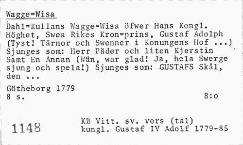 //// Wagge=Wisa //// Dahl=Xullans Wagge=Wisa öfwer Hans Kongl. Höghet, Swea Rikes Kron=prins, Gustaf Adolph (Tyst! Tärnor och Swenner i Konungens Hof ...) Sjunges som: Herr Päder och liten Kjerstin Samt En Annan (Wän, war glad! Ja, hela Swerge sjung och spela!) Sjunges som: GUSTAFS Skål, den ... //// Götheborg 177S //// 8 s. 8:0 //// . . . n KB Vitt. sv. vers (tal) //// 114a kungl. Gustaf IV Adolf 1779-8S ////