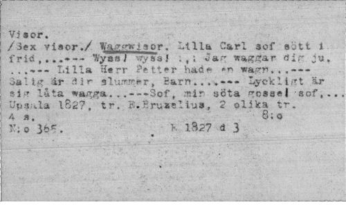 //// Visor. //// /3ex visor./ Wyr^visor. Lilla Carl sof sött i frid ,.. — Wysa i 'vsyasI . ,; waggar dir ju. //// Lilla Herr Petter hade »n wasrr>, , .--- //// 3a 1 Ut 'år d 1 r slurnrrer, Kärr»Lyck 1 i rrt är si£ låta . .. --*3of, ,r,ir söta ^csaei sof,.., //// Up^la 1827. tr. K.Bruaeliua, 2 olika tr. As. 8;o //// ?v; o 36*. 1327 d 3 //// « ////