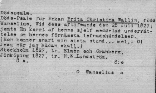 //// Död spsalm. //// Döds-Psalm för Enkan Britji Chri at i. t! a Wall in. född Wanselius, Wid dess afTi fwande den^B^^uTT "1827; jemte En korrt af henne sjelf meddelad underrättelse cm hennes förnämsta lefnadshändelser. (Hon kommer snart min sista stund... mel.; 01 Jesu när jag hädan skall.) Stockholm 1827, tr. Elmén och Granberg, Jönköping 1827, tr. K,-Lundström. //// 8 s. 8:o //// O Wanselius a ////