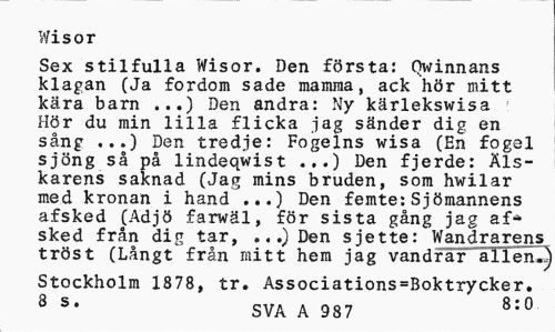 //// Wisor //// Sex stilfulla Wisor. Den första: Qwinnans klagan (Ja fordom sade mamma, ack hör mitt kära barn ...) Den andra: Ny kärlekswisa Hör du min lilla flicka jag sänder dig en sång ...) Den tredje: Fogelns wisa (En fogel sjöng så på lindeqwist .,.) Den fjerde: Älskarens saknad (Jag mins bruden, som hwilar med kronan i hand ...) Den femte:Sjömannens afsked (Adjö farwäl, för sista gång jag af-sked från dig tar, ...) Den sjette: Wandrarens tröst (Långt från mitt hem jag vandrar allelu? //// Stockholm 1878, tr. Associations=Boktrycker. //// 8 s# SVA A 987 8:0 ////